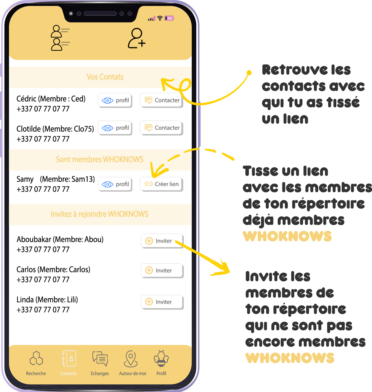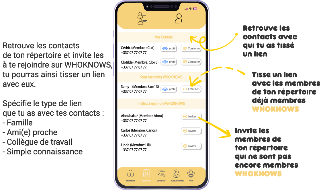 Retrouve les contacts de ton répertoire et invite les à te rejoindre sur WHOKNOWS, tu pourras ainsi tisser un lien avec eux